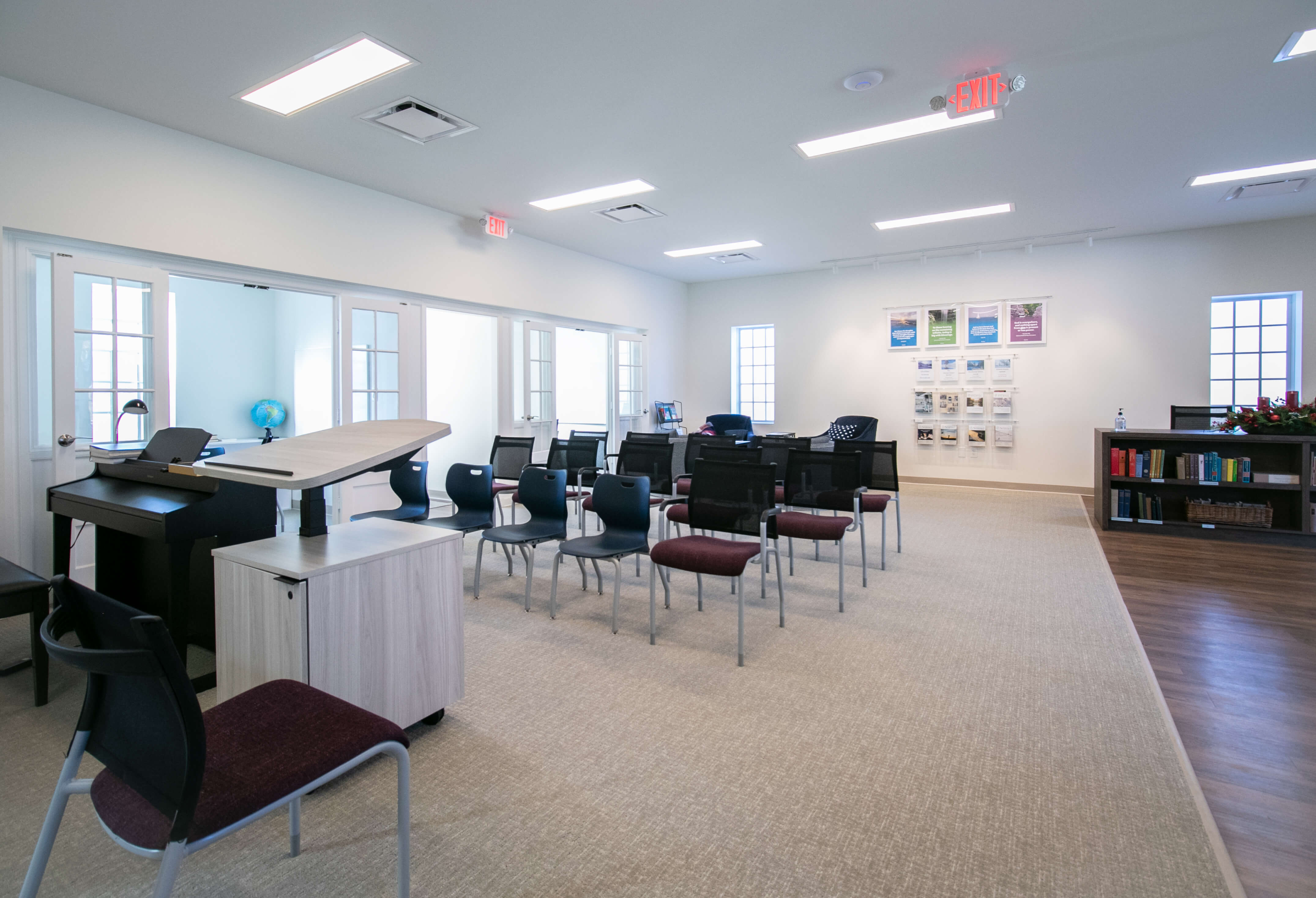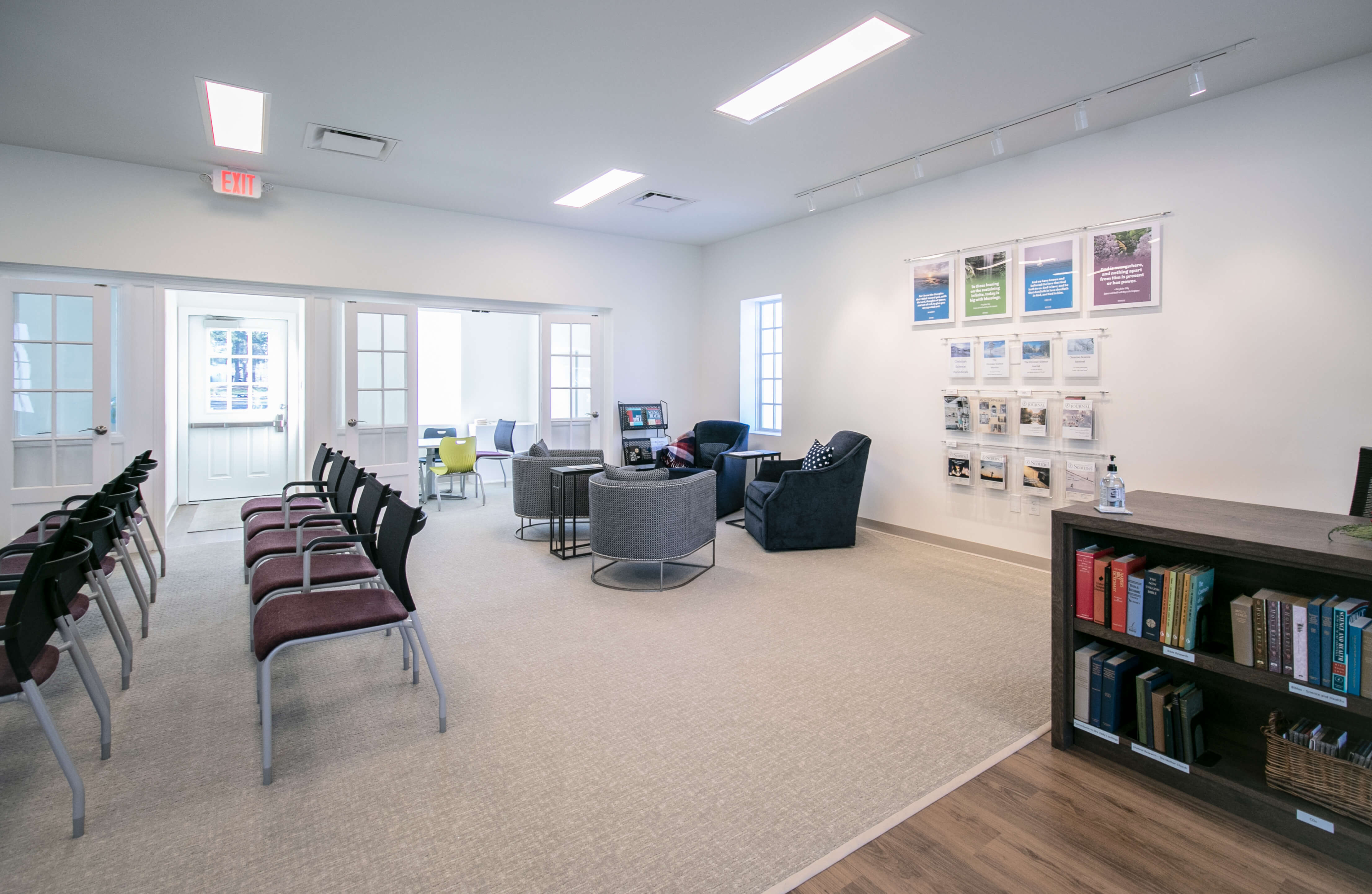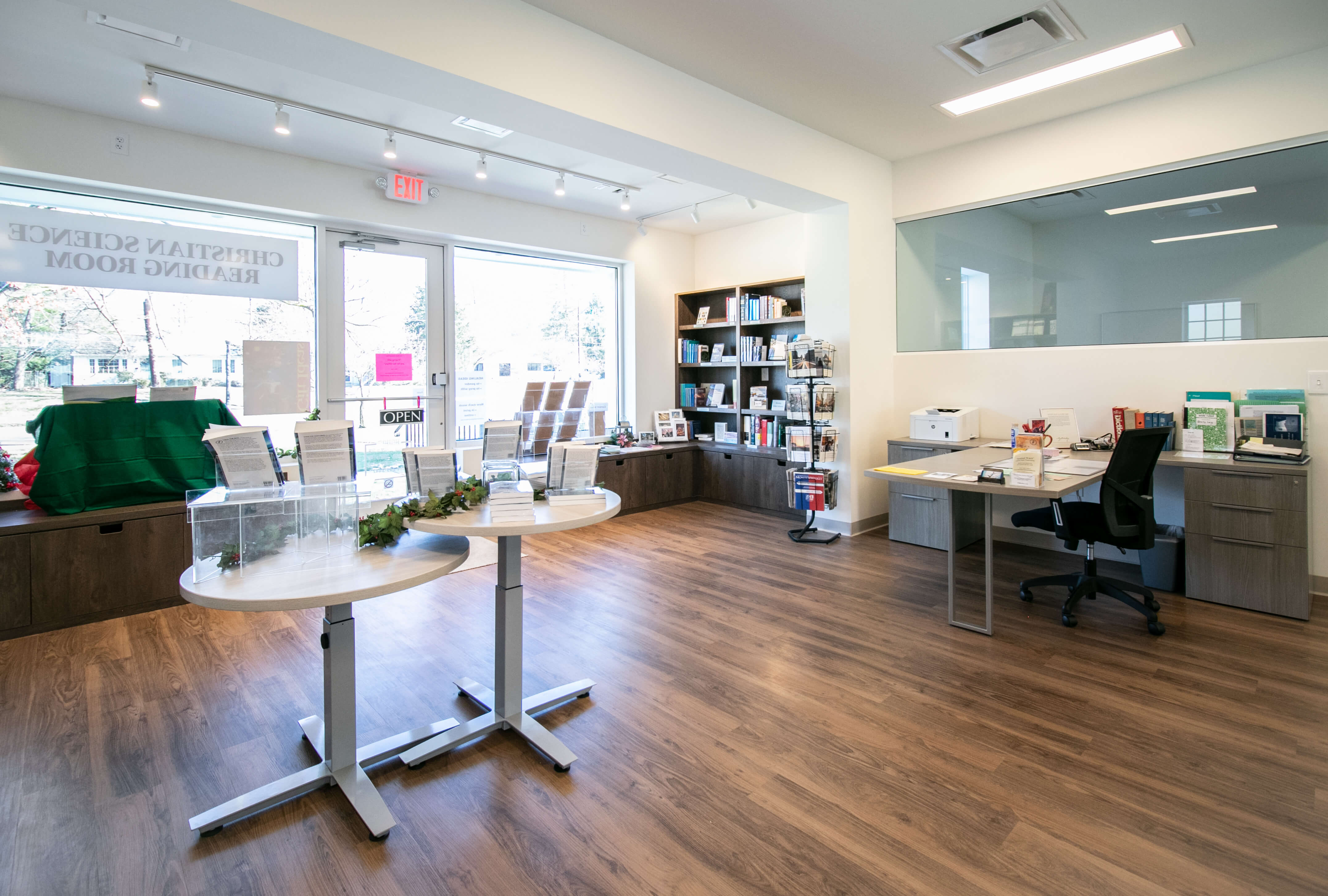 The church renovation included a reception area, restrooms, meeting areas, and a new reading room. Modern finishes were used, while maintaining the historical character of the building. A new exterior storefront and columns were constructed to match the existing.