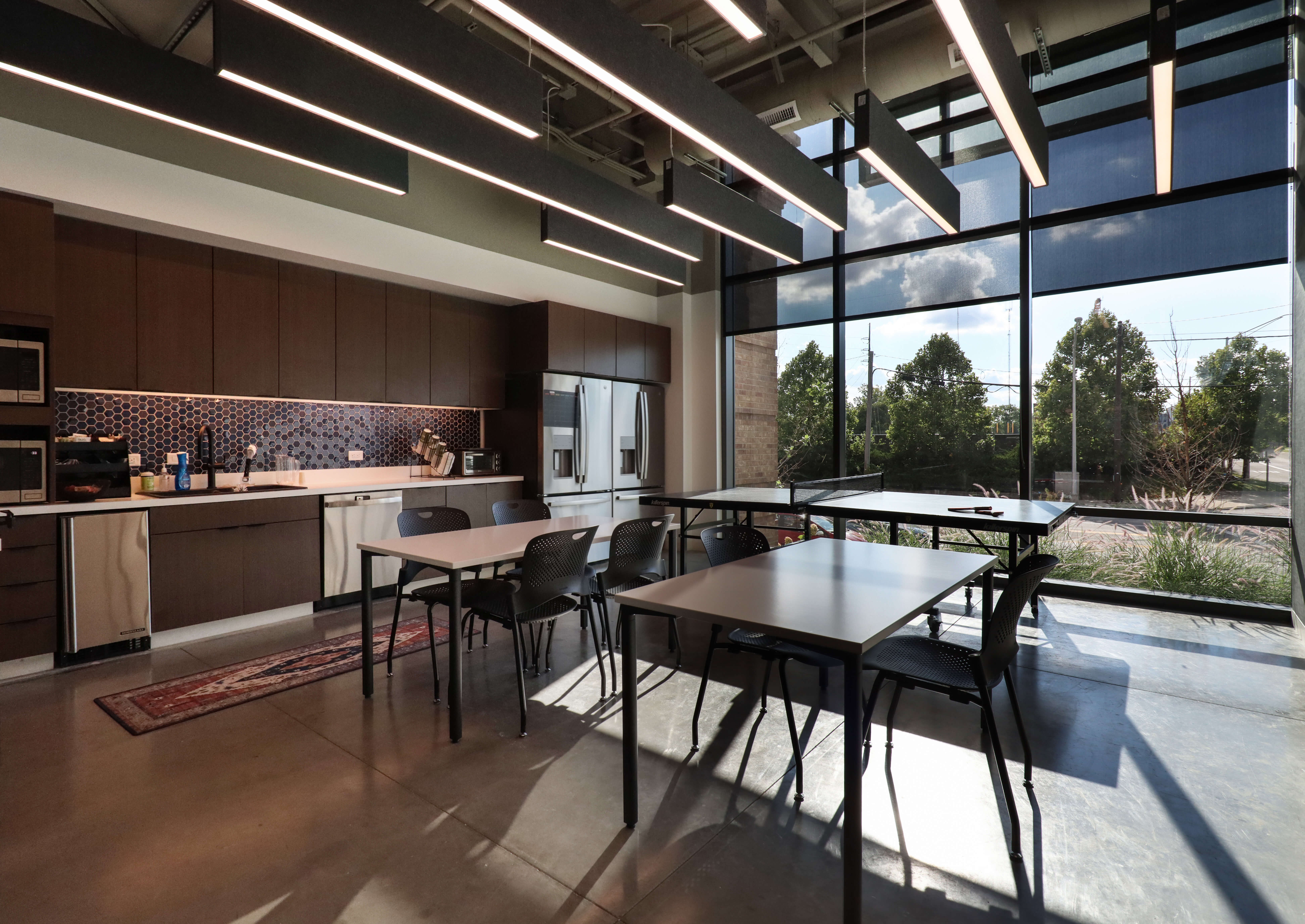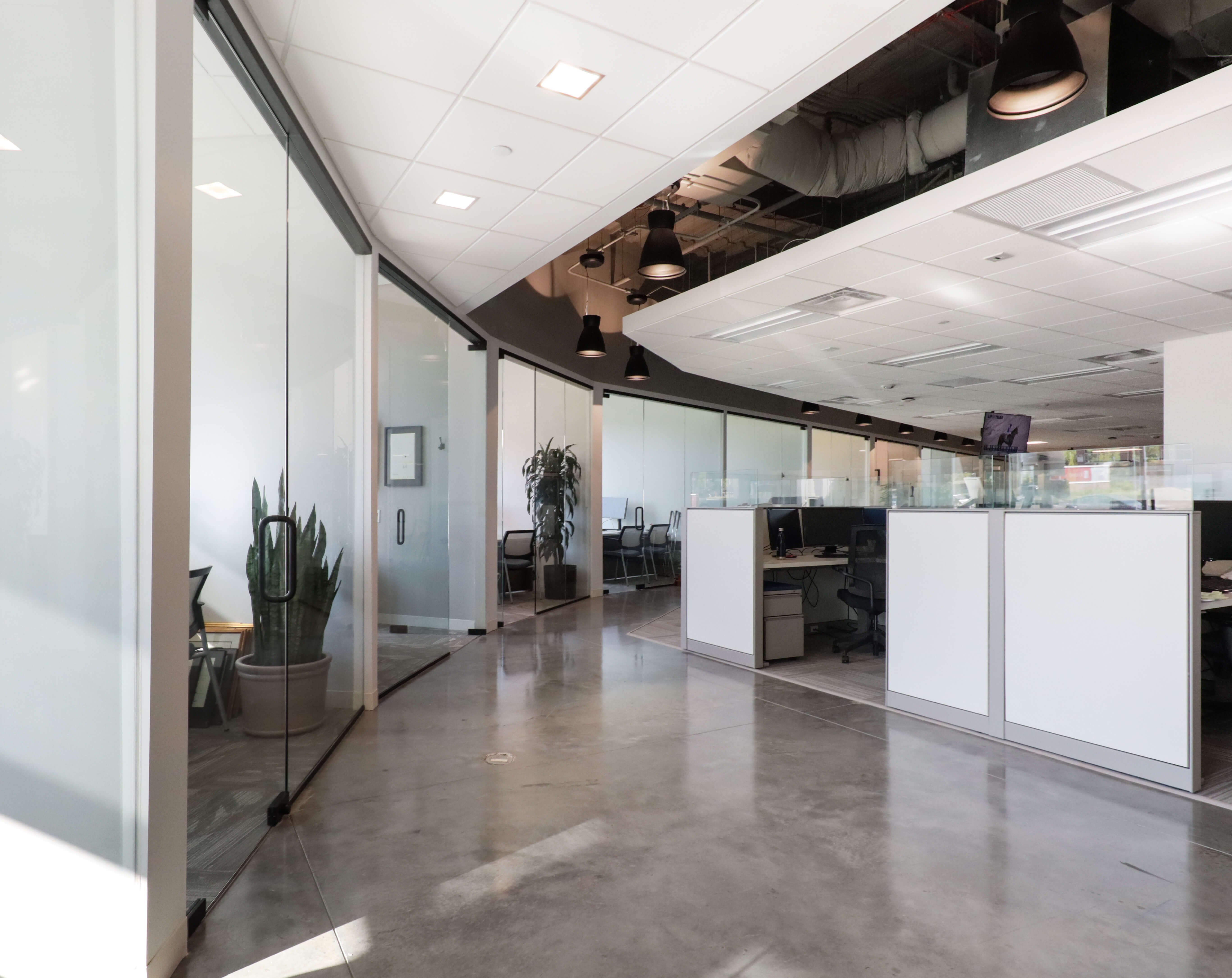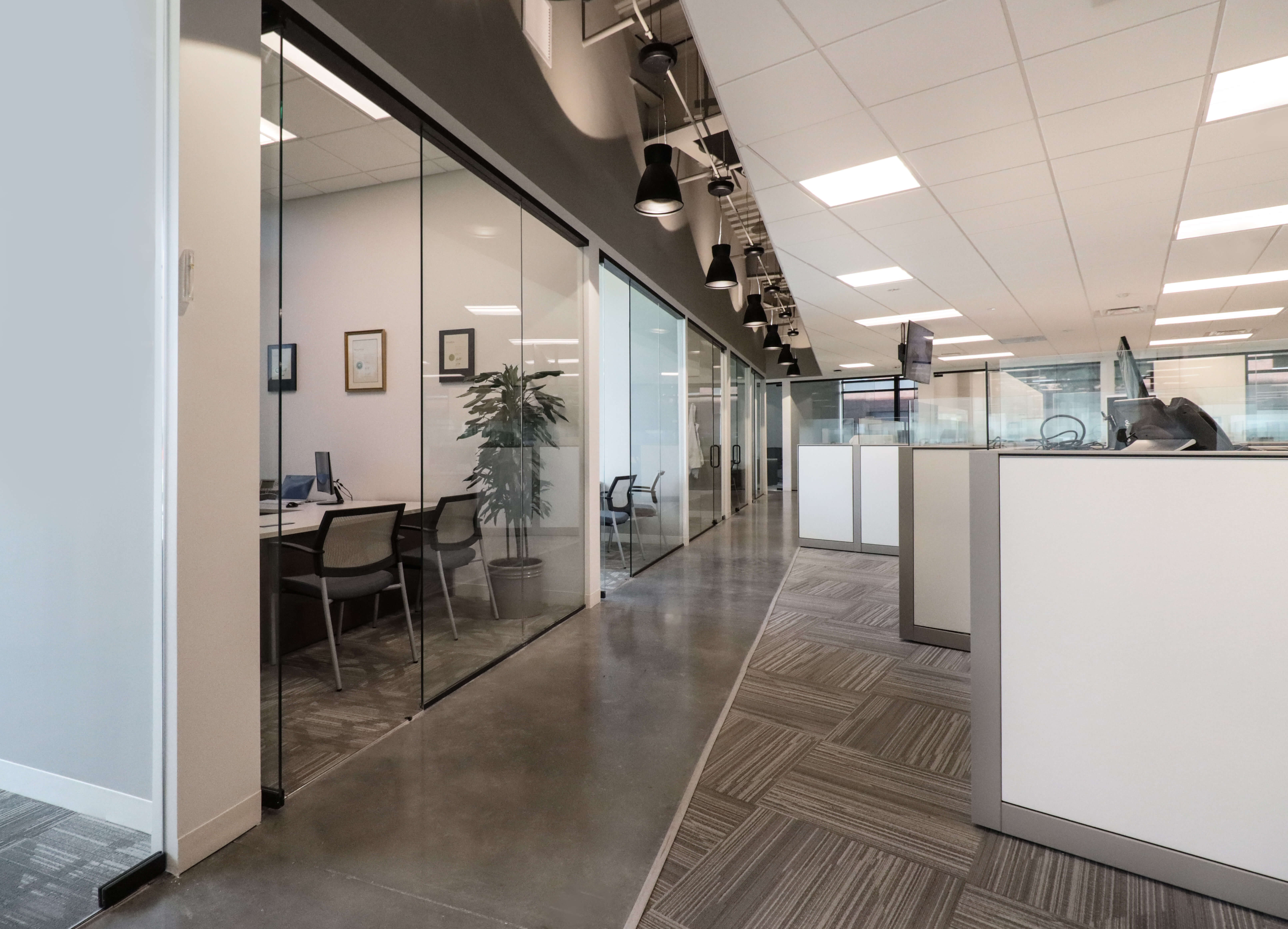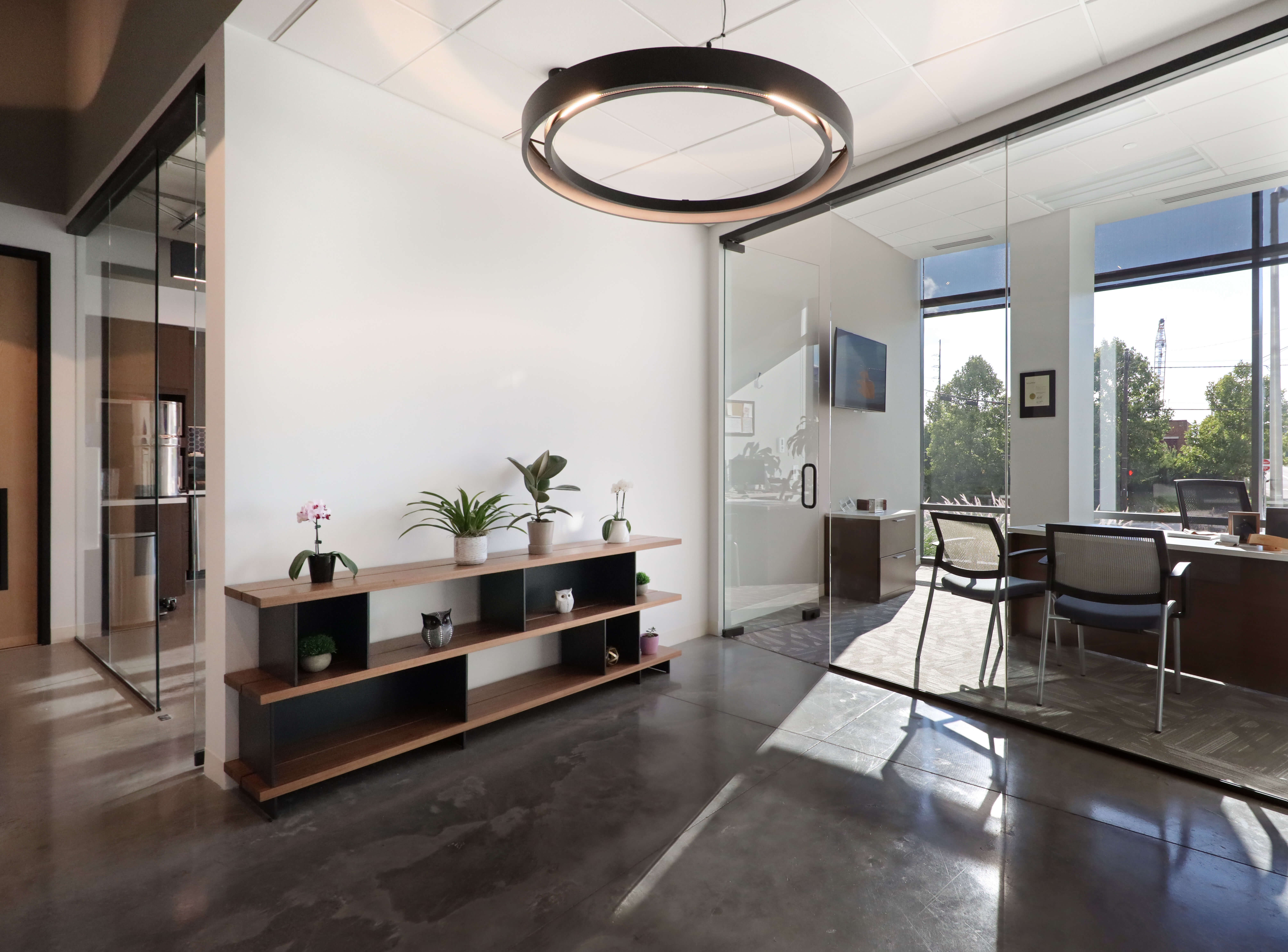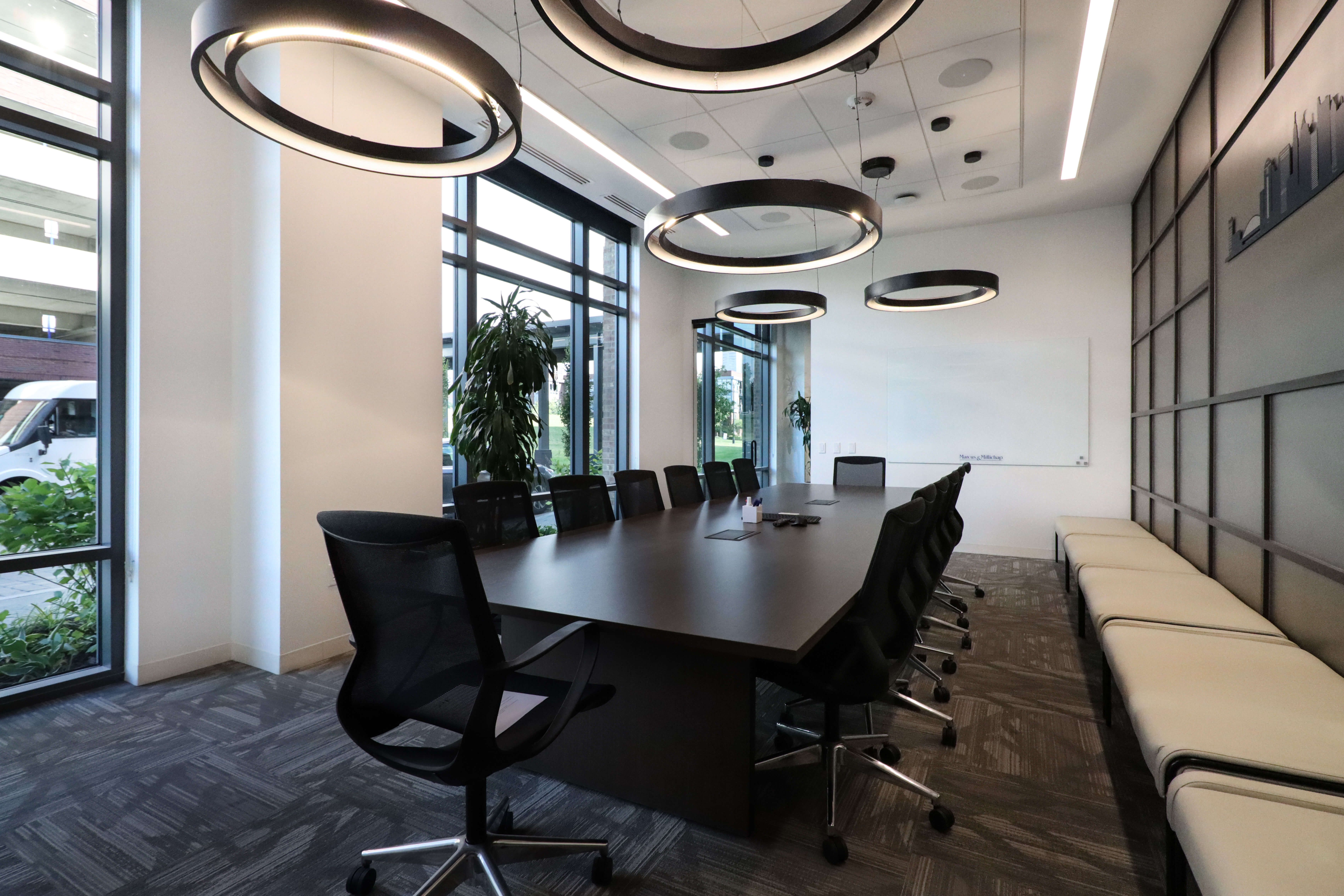 Marcus & Millichap had a firm move-in date, but faced long material lead times. Lehman Daman worked proactively and collaboratively with NRI, Marcus & Millichap, subcontractors, and suppliers to understand lead times and bring creative solutions to the table, such as substitutions or temporary fixtures. For example, Lehman Daman found out that glass front doors had a shorter lead time than the original wood doors that were chosen, so Marcus & Millichap could switch products. With lighting backordered, Lehman Daman used temporary fixtures.